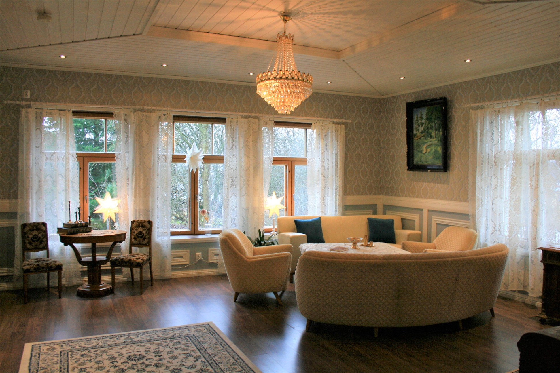 lakerrassa sijaitsevassa sinisessä huoneessa yöpyy koko perhe.